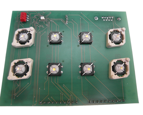 DKP2-BCD: Extended version for 8 outputs, implemented from BCD inputs; connection via two 10-pin pin headers, DSUB9 for programming and 6-pin Micro-Match connector.
